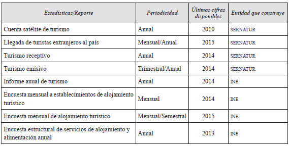 El caso chileno es particular, dado que el manejo de sus estadísticas turísticas no se lleva a cabo por medio de un sistema unificado. Se mencionan a continuación los diferentes informes, reportes y cuadros estadísticos elaborados, iniciando por los construidos por el SERNATUR y continuando con los elaborados por el INE.