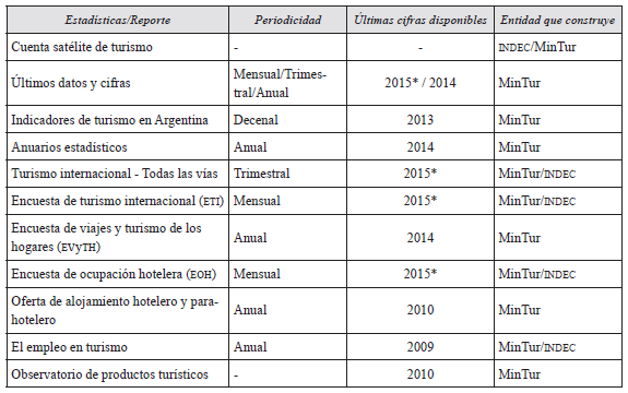 En la tabla 2 se muestran en detalle la periodicidad y la actualidad de los reportes y estudios construidos por el sistema de estadísticas turísticas de Argentina.