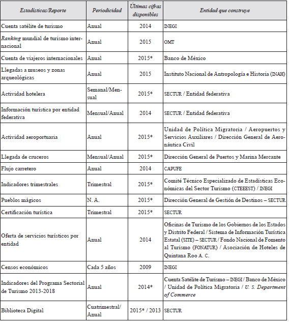 Como se mencionó antes, el sistema de estadísticas turísticas de México es significativamente más consistente si se compara con el de otros países de Latinoamérica. Desde lo 'macro', el país cuenta con datos de cuenta satélite de turismo al año 2014 (año base 2008) y tiene como principal dato que el turismo representa el 8,6 % del PIB, dato que también es desagregado según las actividades características del turismo definidas por la OMT. Estas cifras son construidas por el Instituto Nacional de Estadística y Geografía (INEGI) y facilitan la comparación del turismo mexicano con el de otros países del mundo.