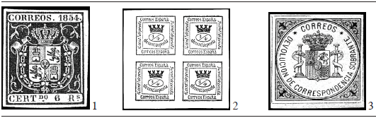 La simbólica en filatelia, que tanto le era fundamental a Hill, padre de la estampilla, se ve reflejada, en un primer tiempo, en elementos que evocan el castillo sin verdaderamente mostrarlo en su integridad. Se trata de la figuración por medio de la heráldica. El primer escudo filatélico español, emitido en 1854, contiene entre sus cuarteles dos torres esquematizadas, símbolos del castillo (ver figura 1 en Anexos). Este escudo "pequeño" de armas, tomado de la numismática -a juzgar por las características de las monedas de ese momento-, es la forma metonímica del reino de Castilla, de la misma forma que los dos otros cuarteles con los leones representan el reino de León. Este escudo de armas está acompañado, además, por el escusón con las flores de lis de la Casa de Borbón y del entado de punta6 de las armas de Granada.