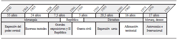 En el primer Franco, el "estructurante" (periodo 6), se sentaron las bases de un pensamiento, de una línea de acción. Con Castilla como generadora de una idea de país, Franco fundamentó su primacía en el poder. Ante la celebración del Milenario de Castilla, en 1944, el régimen enfatizó alegóricamente en la tradición, representando cinco fortalezas incrustadas en escudos y un torreón (el de Doña Urraca, en Covarrubias, al sur de Burgos). Este bloque (figura 5) marcó un hito en la representación de baluartes como sinécdoque de la región y metonimia de una cultura: la España castellana, la tradicional, la generadora de la civilización hispánica. Franco puso el acento sobre esta identidad hidalga, forjadora de valores, de una lengua y de una tradición católica ejemplar para todo el país.