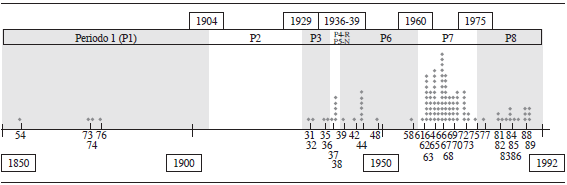 Para esto, es fundamental precisar el corpus de imágenes y luego proceder a su fraccionamiento. Partimos de unos 2400 sellos españoles de todo tipo, emitidos y puestos en circulación entre 1850, fecha del primer sello español, y 1992, año de la firma del Tratado de Maastricht, que institucionaliza la creación de una nueva entidad, la Unión Europea (UE). Dentro de este periodo de 144 años, se pudo constatar una fragmentación de la ilustración; el periodo presenta, por así decirlo, "altibajos". Estas fracturas son debidas tanto a aspectos visuales como a tendencias histórico-socio-políticas. Así, por ejemplo, ciertos rasgos de la imagen, en un momento dado, nos muestran un cambio suficientemente importante -en la ilustración y en el estilo del momento- para considerar que entramos en otro periodo visual, como sucedió en 1904, cuando se pasó de formatos cuadrados a rectangulares, de efigies individuales a parejas de personajes, de la formalidad de salón a la informalidad del cotidiano (Monroy, 2011, p. 62). Se consideraron también variantes relativas a las circunstancias políticas o sociales del país; algunas de ellas determinaron un viraje tal que obligó a un cambio de periodo visual, como ocurrió con el estallido de la guerra civil en 1936, o bien, con la muerte de Franco en 1975. La figura 10 en Anexos ilustra esta fragmentación, no homogénea, pero ampliamente significativa.