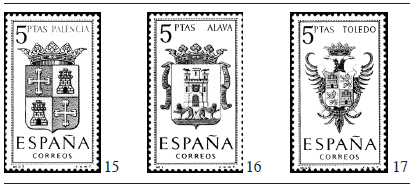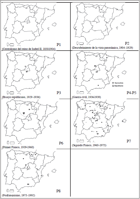 En la secuencia de siete mapas (ver cartografía en la figura 12) se revela la concentración de esta primera representación en torno de Madrid, epicentro del poder central, en una España marcada por la centralización de Isabel II y reflejada en sectores tan diversos como las instituciones públicas, la Banca y la moneda, la historia nacional, el arte y, en términos globales, la conciencia nacional (Pérez, 1996, p. 590). La estampilla es el reflejo de esa tendencia, y, evidentemente, las torres se concentran sobre la ciudad capital marcada con estrellas, que indican el aspecto simbólico de la representación en lo que concierne el periodo 1, pero no al 2, en el que hay ausencia total de signos. Hay que señalar que la representación simbólica en los escudos reapareció más tarde durante el franquismo, entre los años de 1962 y 1966 (ver mapa P7), incluidos dentro de los bloques de escudos de ciudades capitales de provincia. En ese momento, treinta de los más de cincuenta escudos contienen índices de castillos en su heráldica, lo que es altamente representativo.