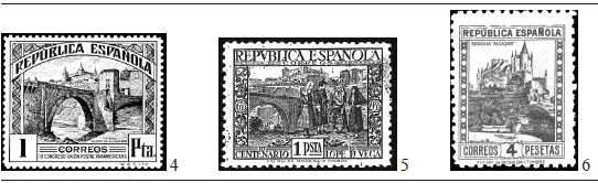 El símbolo comenzó a borrarse lentamente, pero sin dejar de serlo totalmente. El primer castillo filatélico fue un alcázar, el de Toledo, que aparece en segundo plano, ayudando a reforzar el contenido del primer plano: el puente de Alcántara, en un sello de octubre de 1931 bajo la II República (ver figura 2). El edificio, aunque representado figurativamente, sigue siendo un símbolo discreto de la ciudad, dejando que la narración sea dirigida principalmente al acceso de entrada a Toledo. Esta función "presencia/ausencia" tiende a repetirse en otras ocasiones en las que el castillo, como telón de fondo, contribuye a darle fuerza a la narración, haciendo llamado a contenidos memoriales colectivos. El ejemplo más cercano de esta modalidad apareció tan solo pocos años después (en 1935) cuando, conmemorando al célebre escritor Lope de Vega, se reprodujo una escena de la obra Peribáñez. Utilizando la misma perspectiva anterior de Toledo y escenificando apartes de la pieza, se logra visualizar e identificar el alcázar7. Aquí el edificio, con su monumentalidad, cumple funciones de referente, símbolo e ícono de la ciudad.