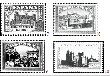La enunciación busca un arraigo de valores y de tradición en momentos de toma de posiciones no solo territoriales. Es así como un año después, y en 'fanfarria", apareció el bloque Monumentos Históricos, entre los cuales se encuentra una vez más la imagen del Alcázar de Segovia. Ya veíamos que este fue emitido por los republicanos en el 32 y repetido en el 38, lo que demuestra la lucha que se llevó también por fuera de las filas militares. Este edificio pareciera erigirse en concepto estratégico dentro de la batalla de las ideas. La centralidad en la cual se posiciona irradia la preeminencia histórica de Isabel la Católica como espíritu de la unidad nacional del reino. El edificio es la conjugación del catolicismo y de la unidad; un símbolo fuerte que contribuyó a confortar la propaganda beligerante. La dictadura militar que se afirmó en el poder en los años posteriores tuvo la oportunidad de valorar estas construcciones medievales, haciendo eco de la recuperación de un mundo ya desaparecido, pero que contenía, sin embargo, valores políticos y religiosos ancestrales.