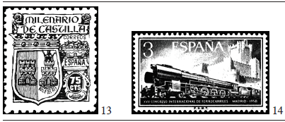 Así, en 1958, en plena coyuntura de políticas económicas, España lanzó un nuevo estilo visual, observable en la filatelia. Con los acercamientos del país a la OCDE y al Fondo Monetario Internacional, siguiendo las preconizaciones de los tecnócratas (Pérez, 1996, p. 816), el país transpuso en sus ilustraciones algunos signos relevantes de este arranque económico. Tal es el caso de la imagen de la locomotora 242-F pasando rauda delante del Castillo de La Mota, pretendiendo un ritmo diferente en las políticas nacionales luego de un largo periodo de oscurantismo de posguerra. Tradición y modernidad se aliaron en esta alegórica imagen que presagiaba tiempos prósperos y prometedores (figura 5).