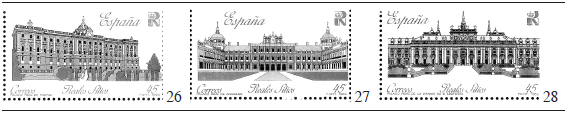 Las últimas imágenes de castillos se van esfumando en provecho del palacio. Tres de las cuatro imágenes pertenecientes a la serie de Patrimonio Artístico Nacional de 1989 corresponden a los palacios reales de Madrid, de Aranjuez y de la Granja de San Ildefonso (figura 9). La elegancia del trazado, la armonía del color y la imponente perspectiva reflejan la voluntad oficial de canalizar la visión de lo que otrora hubiese podido ser una fortificación militar defensiva, que se convierte en residencia palaciega de monarcas, y hoy en sede de eventos oficiales o en museo histórico y cultural. Estos tres palacios son eminentemente urbanos y se convierten, además, en hitos de la estructura de la ciudad, dejando atrás el típico elemento paisajístico de la escena castellana. Las flechas, los arcos, las ventanas y portalones forman parte de una estructura arquitectónica que evoca más el prestigio de una nobleza y la expresión artística de un arquitecto, que el ingenio militar en las artes de defensa y de expansión territorial.