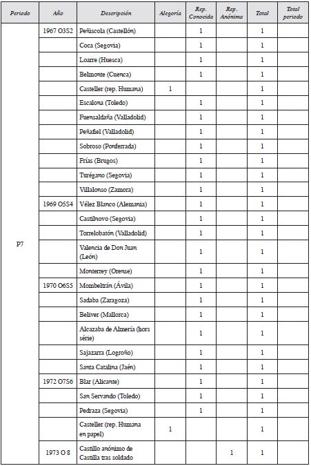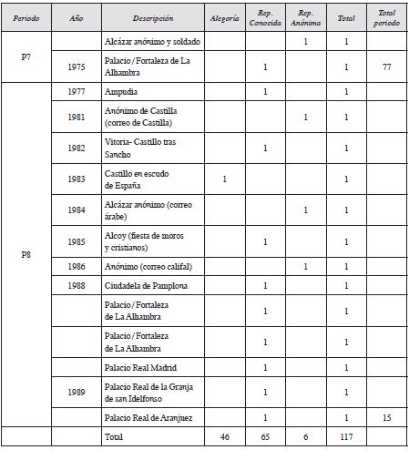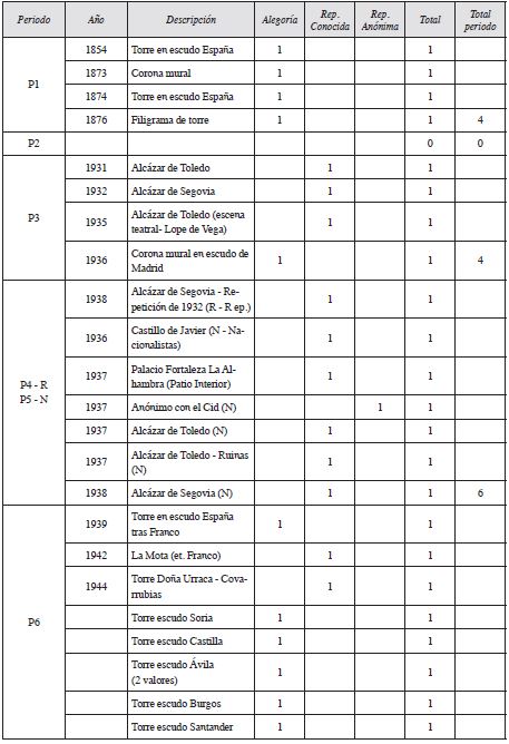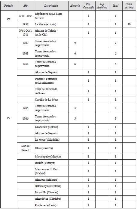 Así como los primeros ochenta años (P1 y P2) se caracterizaron por un desprecio evidente del castillo -con excepción de las primeras menciones simbólicas de torres incrustadas dentro de escudos de armas-, la emisión masiva de los años sesenta revela una voluntad creciente por comunicar sobre los aspectos patrimoniales dentro de las políticas liberales de los tecnócratas franquistas. Entre estos extremos se encuentran tanto las etapas moderadas de los años treinta y cuarenta como las menciones discretas y algunas veces palaciegas del posfranquismo, a finales de los años setenta y en los ochenta.
