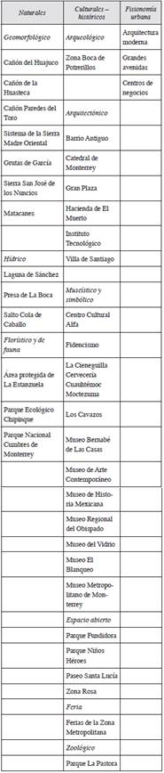 La estructura territorial del turismo regio-montano fue estudiada por Sánchez Crispín, López López & Propin Frejomil (2005), quienes notaron la existencia de un paisaje urbano único diferenciado de otras ciudades mexicanas, así como la existencia de un patrimonio cultural e histórico sustancial, producto del carácter industrial de la urbe. Así mismo, haciendo una especie de marco, el contexto geográfico natural se caracteriza por la presencia de la Sierra Madre Oriental y sus sistemas conexos, así como también por los sistemas hídricos de los alrededores, aunado todo ello a la dotación de servicios turísticos disponibles. Lo anterior llevó a dichos autores a concluir que los flujos turísticos hacia la ciudad continuarían siendo de importancia a corto plazo por su capacidad de ofrecer una combinación de recursos culturales y naturales de forma privilegiada. La tabla 1 sintetiza los recursos identificados dentro de la estructura territorial del turismo en Monterrey.