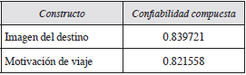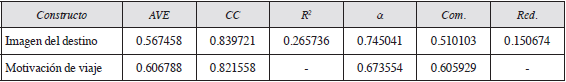 Una vez estimados los parámetros del modelo por medio del software de análisis estadístico Smart PLS, se identificaron los componentes principales de ambas variables, que se consignan en la tabla 5. En el caso de la variable motivación de viaje, se identifican tres componentes, todos ellos de tipo pull. En el caso de la imagen del destino, se identifican cuatro componentes, dos de tipo afectivo y dos de tipo cognitivo (tabla 5).