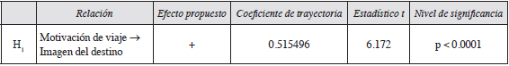 La hipótesis de investigación planteada en la primera parte de este trabajo fue que existe un efecto determinante directo y positivo de la motivación de viaje sobre la imagen percibida del destino. La evidencia empírica obtenida a partir del contraste del modelo con los datos recogidos de la población objeto de estudio muestra un efecto positivo y directo de la motivación de viaje sobre la imagen del destino a partir del coeficiente de correlación R2 obtenido, de 0.265736, el cual es estadísticamente significativo (p < 0.0001), por lo tanto, la hipótesis puede aceptarse.