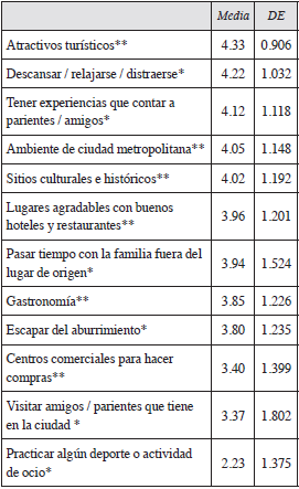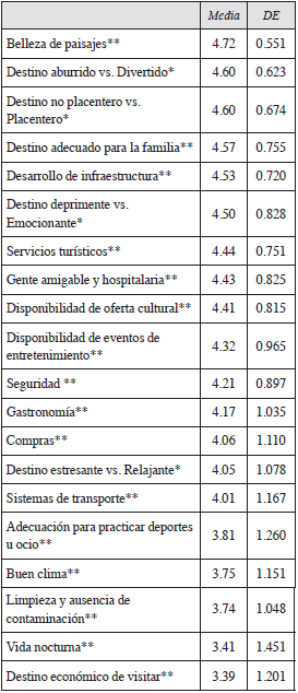 La muestra definitiva estuvo integrada por turistas con las características demográficas resumidas en la tabla 2 (N = 649), mientras que las medias para cada uno de los ítems de imagen de destino y motivación de viaje se presentan en las tablas 3 y 4, respectivamente.