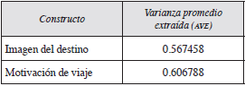 Por medio de los valores superiores a 0.50 de la varianza promedio extraída (AVE, por sus siglas en inglés de Average Variance Extracted), es posible evaluar que los constructos son válidos a nivel convergente. La tabla 7 muestra los valores obtenidos para los constructos del modelo.