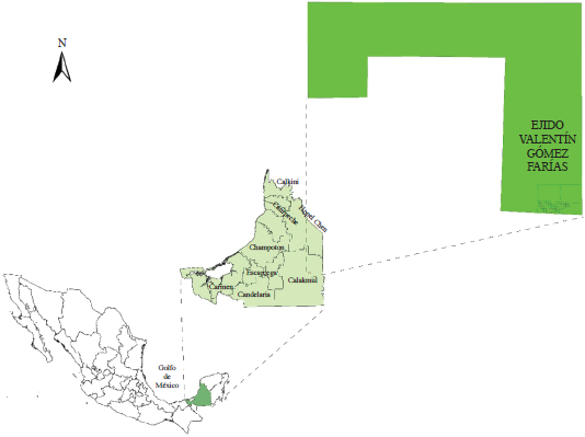 El área de estudio se limita a la comunidad ejidal1 de Valentín Gómez Farías, localizada a cinco kilómetros de la cabecera municipal de Calakmul, en el sur del estado de Campeche (figura 1). Cuenta con una población de 336 habitantes y una superficie de 1500 hectáreas. El ejido fue establecido por decreto presidencial el 2 de agosto de 1973, y tiene un padrón de 28 ejidatarios con derechos de uso de la tierra.