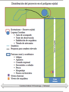 Con base en la actividad ecoturística en la laguna Carolina, "Valentín Natural" pretende implementar en el futuro proyectos de turismo rural y académico en el área de uso intensivo del ejido con parcelas demostrativas de fácil acceso (figura 2), donde los visitantes puedan aprender las técnicas que los ejidatarios llevan a cabo para el manejo de la vegetación secundaria y la reforestación bajo dosel (Herrera, 2014). El objetivo es que los ejidatarios y los pobladores de la comunidad puedan realizar de manera independiente sus propios emprendimientos de turismo rural y obtener beneficios económicos bajo el auspicio de “Valentín Natural”, utilizando las tierras parceladas en el caso de los ejidatarios, o la zona urbana del ejido para el caso de los pobladores.