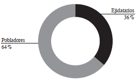 Se encuestó a un total de 39 hogares en la comunidad de Valentín Gómez Farías. Los hogares encuestados están integrados en promedio por 4.8 miembros. Poco más de la tercera parte de los encuestados son ejidatarios y el resto son pobladores, es decir, personas que habitan en la comunidad, pero que no tienen derecho a usar las tierras del ejido y que, por lo tanto, no participan dentro del Comité de Turismo Comunitario que dirige el proyecto "Valentín Natural" (figura 3). La mitad de los entrevistados (54 %) son varones, y el porcentaje restante (46 %) son mujeres. La edad promedio de los encuesta-dos es 40.1 años.