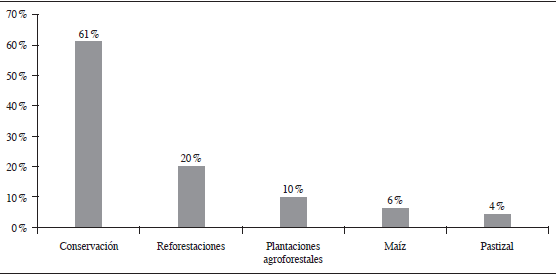 Los ejidatarios tienen en promedio una dotación de 34.5 hectáreas de las tierras comunales del ejido para su uso productivo. En promedio, los ejidatarios utilizaron en el último año 19.7 hectáreas de su dotación ejidal, de las cuales, la mayor parte (90 %) la dedicaron a usos relacionados con la conservación, la reforestación y la restauración. Solamente 10 % del uso del suelo de las parcelas es de carácter agropecuario (figura 4).