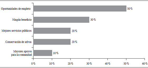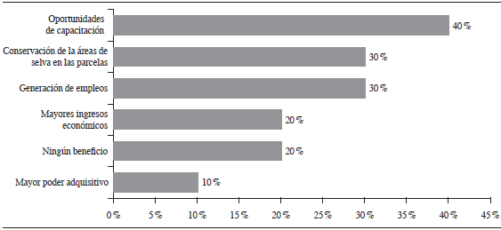 Entre los beneficios que los encuestados han obtenido por su participación dentro del proyecto "Valentín Natural" se destacan las oportunidades de capacitación, la generación de empleos y la conservación de la selva (figura 5). Una quinta parte (20 %) de los participantes no reconoce ningún beneficio derivado del proyecto, no obstante, son socios del Comité de Turismo Rural (figura 5). Para la comunidad, el principal beneficio directo que los habitantes identifican es la generación de empleos. Sin embargo, estos empleos son esencialmente los jornales que se generan por las actividades de restauración ecológica y el mantenimiento del área de servicios ambientales de la comunidad, y no precisamente de la actividad ecoturística. Desde la perspectiva de los encuestados, "Valentín Natural" ha sido un factor relevante para que el ejido prosiga con la gestión de sus tierras a favor de la conservación. La relevancia adquirida por la comunidad en esta tarea los ha beneficiado también con la aplicación de mayor número de programas de apoyo y la dotación de mejores servicios públicos por parte de los diferentes niveles de gobierno (figura 6). En contrasentido, la tercera parte de los encuestados (30 %) no identifica beneficio alguno derivado del proyecto ecoturístico para la comunidad.