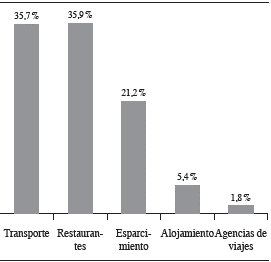 Como lo representa la figura 1, los servicios relacionados con el servicio de transporte (35,7 %) y restaurantes (35,9 %) son los que generan la mayor parte de la población ocupada en las denominadas industrias turísticas.