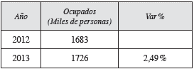 En términos absolutos, la ocupación en turismo correspondió a 1726 personas en 2013; esto representa una variación positiva del 2,49 % en relación con el año inmediatamente anterior. Esta cifra, con base en el concepto de cadena productiva explicado antes, corresponde a una participación del 8,2 % del total de ocupados en Colombia por el sector turismo. Seguramente, si se dispusiera de datos regionales o locales, esta participación sería mucho más representativa en las economías de destinos turísticos consolidados, como Bogotá, Cartagena, San Andrés, Santa Marta y Medellín.