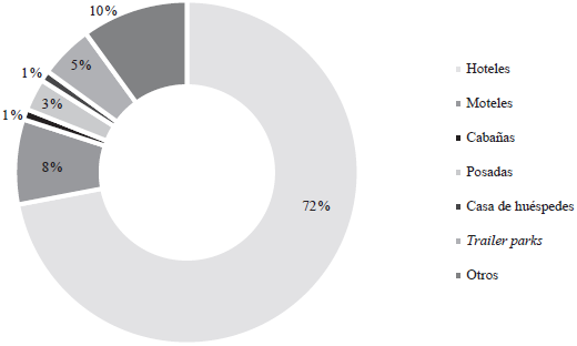 De acuerdo con el INEGI (2014), de los 179 establecimientos registrados en Mazatlán en 2012, hay 128 hoteles, 15 moteles, 2 casas de huéspedes, 1 cabaña, 6 posadas, 9 establecimientos de tipo trailer parks y los 18 restantes son concebidos como otro tipo de establecimientos, entre los que se pueden encontrar bungalós, campamentos, condominios, departamentos, hostales y villas (ver figura 1). En suma, de 11.235 cuartos de hotel ofertados en el puerto, la gran mayoría (9.591) son de hotel, seguida por 564 cuartos de motel y 528 espacios para casas rodantes; el resto se distribuye entre otro tipo de alojamientos.