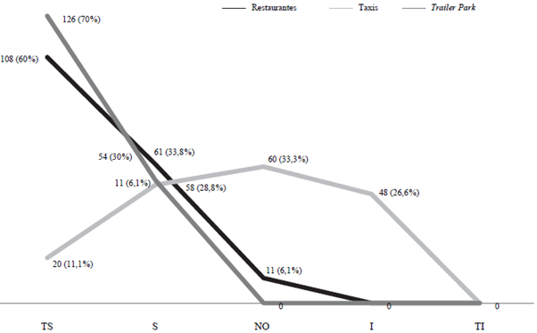 Los trailer parks, como parte de los centros de hospedaje en los que arribaron los turistas entrevistados, fueron los sitios con más alta valoración al ser calificados por el 70 %> de los respondientes como totalmente seguros (TS), seguido de un 30 %> que los señaló como seguros (S), sin valoraciones negativas. En lo concerniente a los restaurantes de la localidad, también recibieron evaluaciones positivas, ya que el 60 %> los percibió como totalmente seguros (TS), 33,8 % los valoró como seguros (S) y solo un 6,1 % no opinó (NO), debido a que no había consumido dichos servicios. El único rubro que recibió bajas calificaciones corresponde al servicio de taxis: solo un 11,1 °/o lo consideró totalmente seguro (TS), un 28,8 % lo evaluó como seguro (S), seguido del 33,3 %> que no pudo opinar (NO), pues no había tenido la necesidad de utilizarlo; no obstante, un 26, 6% valoró el servicio como inseguro (I).