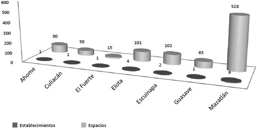 De los 19 trailer parks y 941 espacios registrados en Sinaloa en 2012, Mazatlán fue el destino con mayor número de establecimientos y espacios registrados para casas rodantes (INEGI, 2014), tal como se muestra en la figura 2. Es preciso mencionar que, si bien falta información documental sobre esta actividad desde la década de los noventa hasta la actualidad, una nota periodística señaló que en 2010 Sinaloa tenía registrados 1.158 espacios para casas rodantes, de las cuales Mazatlán poseía 801, lo que implicaría una notable disminución de este servicio de hospedaje durante los últimos años, fenómeno atribuido principalmente a problemas de inseguridad (López, 2010).