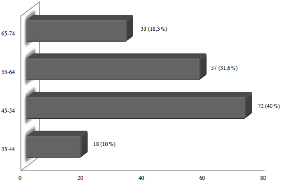 La primera sección del cuestionario aplicado a turistas que arribaron en casas rodantes al puerto de Mazatlán (Sinaloa) mostró que la mayor parte de los respondientes procedía de Canadá (72,7 %>), mientras que el resto provenía de Estados Unidos (27,3 %>). Del total de respondientes, 129 (71,6 %>) pertenecen al sexo masculino y el resto (28,3 %>) al sexo femenino. En lo relativo al promedio de edad, es preciso mencionar que la mayoría de las personas (40 %>) tenía entonces una edad de entre 45 y 54 años, mientras que un 31,6 %> se ubicó entre los 55 y los 64 años (ver figura 3), y el resto se ubicó en dos extremos, es decir, 18,3 % era mayor (65-74 años), mientras que el 10 %> dijo tener entre 35 y 45 años cumplidos, representando la población de menor tamaño.