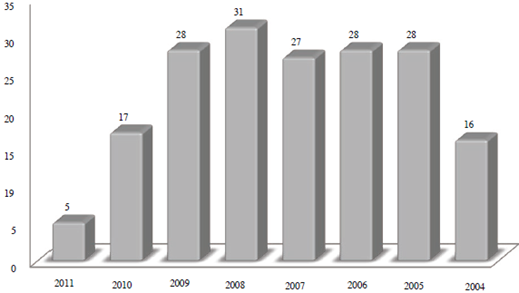 Otra característica de este segmento radica en el tipo y modelo de vehículo utilizado para sus traslados. Al respecto, 59,4 °% usó un motor home, 33,8 % empleó un vehículo remolcable (5thwheel), mientras que el 6,6 °% restante utilizó un pop up camper10. De acuerdo con el año del modelo del vehículo, y considerando la fecha de aplicación del cuestionario11, la mayoría de los vehículos no tenía más de 10 años de uso (ver figura 6), sobresaliendo en mayor número modelos entre 2009 y 2005, con un 76,5 % de los respondientes.