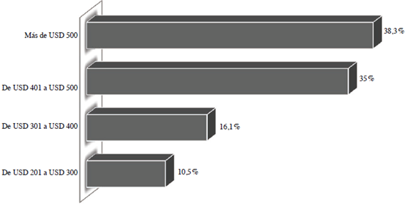 Por su parte, en cuanto al gasto promedio por día para un turista de casa rodante en Mazatlán, los resultados son los siguientes: 40 % manifestó gastar más de 100 dólares diarios; 20,5 %, entre 51 y 75 dólares; 20 %, entre 76 y 100 dólares; y 19,4 %, entre 26 y 50 dólares. Otras cifras que revelan la importancia que tiene el gasto de este segmento turístico se aprecia en la figura 7, cuyo promedio mensual estimado de la gran mayoría eroga más de 400 dólares mensuales (73,3 %).