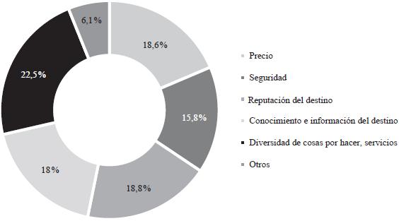 Como parte de los resultados de la tercera sección del instrumento, los dos principales factores que más influyeron en su decisión de viaje fueron la diversidad de actividades por hacer (22,5 %) y la reputación del destino (18 %), respectivamente. No obstante, el conocimiento y la información disponible sobre el sitio, así como el precio, fueron también respuestas concurrentes (ver figura 8), dejando a la seguridad al final, con un 15,8 %; el porcentaje restante señaló en menor medida otros factores relacionados con el clima y el trato de la población anfitriona.