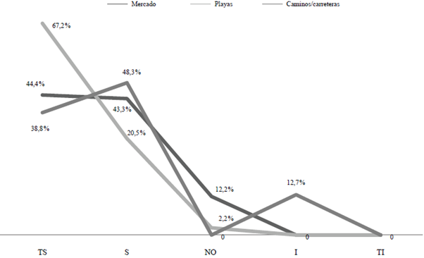 En el caso de las playas de Mazatlán, el 67,2 % de los respondientes las valoró como totalmente seguras (TS), seguido de un 43,3 % que la señaló como seguras (S), sin registrar ninguna valoración negativa, exceptuando a 4 personas que no tenían una opinión al respecto. En lo relacionado con el mercado municipal, punto que mejor distingue a la zona centro del destino, también recibió valoraciones positivas, pues el 44,4 % lo percibió como totalmente seguro (TS), 43,3 % lo valoró como seguro (S) y solo 12,2 % no opinó (NO) debido a que aún no conocía dicha zona. De manera similar, aunque en menor medida, los caminos y las carreteras fueron percibidos positivamente, ya que un 38,8 % de los respondientes los consideró totalmente seguros (TS), un 48,3 % los calificó como seguros (S), aunque, a diferencia de las demás, 12,7 % de los turistas los percibió como inseguros (I).