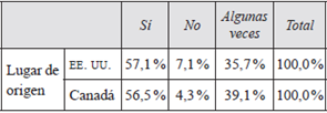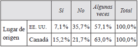 De igual manera, de los resultados de la relación "Lugar de origen - En general, ¿cambia de planes de viaje en respuesta a tales advertencias?" se obtuvo que el 57,1 %> de los estadounidenses y el 63 % de los canadienses algunas veces consideraron cambiar de planes en respuesta a las advertencias emitidas por sus gobiernos. El 7,1 % de los norteamericanos y el 15,2 % de los canadienses sí cambiaron sus planes.