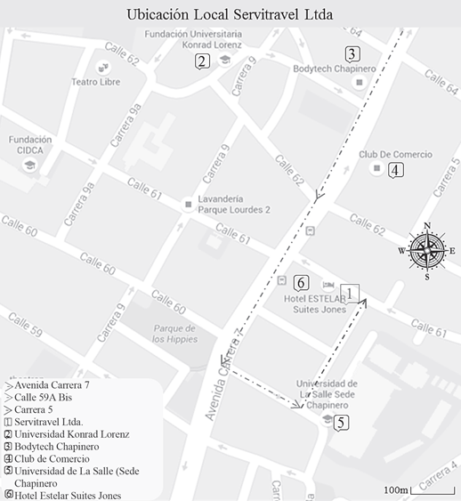 Servi Travel Ltda. se encuentra en la localidad de Chapinero, territorio comprendido desde la avenida Caracas hasta los cerros orientales y de la calle 39 a la calle 100 (Alcaldía Mayor de Bogotá, Localidades, Chapinero). Esta localidad cuenta con la menor tasa de desempleo (Observatorio OISEL Chapinero, 2011, párr. 2); el mayor número de empresas de Bogotá, perteneciendo el 84 % al sector de la agencia (servicios); y con 13,3 años de estudio (Observatorio OISEL Chapinero, 2011, sección "Años de Estudio", párr. 2). A su vez, Chapinero comprende parte de los cerros orientales, por consiguiente, sus principales fuentes hídricas son el río Arzobispo y algunas de las quebradas que surten al río Bogotá (Mena Lozano, 2008, p. 57); sin embargo, las aguas, además de haber tomado un rumbo distinto por ser explotadas más allá de su capacidad, son contaminadas por el vertimiento de aguas residuales, residuos orgánicos y desechos de materiales de construcción (Mena Lozano, 2008, pp. 63 y 64).