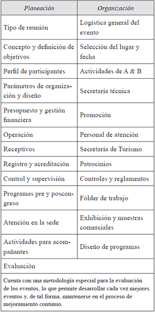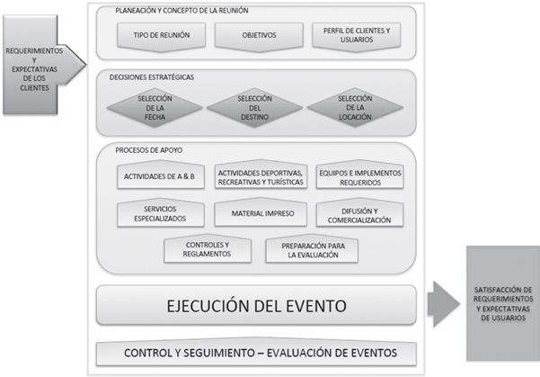 Dentro del flujo de procesos, en un primer momento se tienen las necesidades, las expectativas y los requerimientos del cliente con respecto al evento. Luego están la planeación y la definición del concepto de la reunión; para ello, se especifican el tipo de reunión que se va a realizar, los objetivos y el perfil de clientes y usuarios a los que va dirigida la reunión. Como decisiones estratégicas y fundamentales para lograr el éxito del evento se encuentran la elección de la fecha, el destino y su locación, todo esto en torno al tipo de evento que se va a realizar. Los procesos de apoyo son las actividades de alimentos y bebidas (A & B), deportivas, recreativas y turísticas, equipos e implementos requeridos, servicios especializados, material impreso, difusión y comercialización, controles y reglamentos, además de la preparación para la evaluación. Finalmente se lleva a cabo la ejecución del evento, con el propósito de que en él se vea el reflejo de los deseos de los clientes y, por supuesto, una satisfacción total. Posteriormente se realizan el control, el seguimiento y la evaluación de dicha reunión (É. Blanco, comunicación personal, 29 de septiembre de 2015). Cada una de las fichas con las que cuenta la compañía para planear el evento tiene una función específica dentro de dicha metodología.