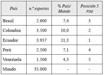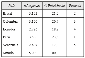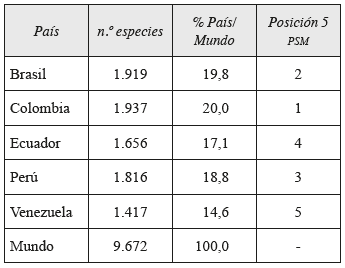 A pesar de que Colombia, Brasil y Perú aparecen en posiciones destacadas en varias listas, esto no quiere decir que Ecuador, por ejemplo, esté en desventaja. Este país, por su pequeño tamaño territorial relativo, es, en realidad, la entidad nacional con mayor biodiversidad por km2en el mundo. Habría que hacer otras consideraciones en relación con el número de especies endémicas en cada país, o bien con el grado de amenaza de extinción a que están sometidas sus especies registradas, o con la validez de las fuentes utilizadas, o bien con la diferencia de años en las distintas publicaciones citadas. A pesar de las imprecisiones mencionadas en latabla 1, en ella se presenta una aproximación a la riqueza en biodiversidad de esos países. Hay cifras alternativas citadas en otras fuentes, por ejemplo, García, Parra y Mena (2014) aportan otras cifras para la diversidad del Ecuador: mamíferos (403), aves (1.656) y peces de agua dulce (951). Igual sucede con las cifras estimadas de especies en el mundo, que muestran desacuerdos importantes: en aves, por ejemplo, Herrera y Lasso (2008) señalan 9.194 especies; Llorente-Bousquets y Ocegueda (2008) hablan de 9.271, y Dickinson (2003) indica que hay 9.720.