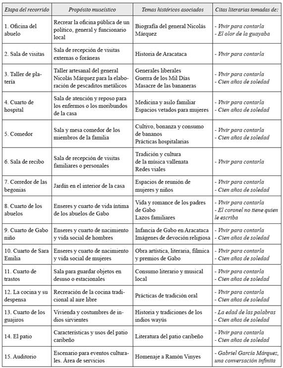 El recorrido por la casa original -de ocho habitaciones conectadas por un corredor alargado- está organizado por estaciones numeradas que cuentan con un relato monográfico de su importancia, con imágenes fotográficas de la familia Márquez, con objetos de la época mencionados por Gabo y comprados a anticuarios de acuerdo con el propósito y tema de cada sala, así como con múltiples recuadros con citas entrecomilladas que contrastan las vivencias del autor según lo expresado en su autobiografíaVivir para contarlay la transformación literaria de esas vivencias al hacerlas parte de las narraciones y descripciones sobre sus personajes en la recreación de Aracataca como el pueblo de Macondo enCien años de soledad.Esa articulación entre la historia vital del autor y su familia contrastada con las historias fantásticas de sus personajes que se presenta en cada sala como parte del guion museográfico permite reconocer a su vez la estructura de un recorrido turístico-literario en el interior del bien patrimonial, el cual se resume en latabla 1.
