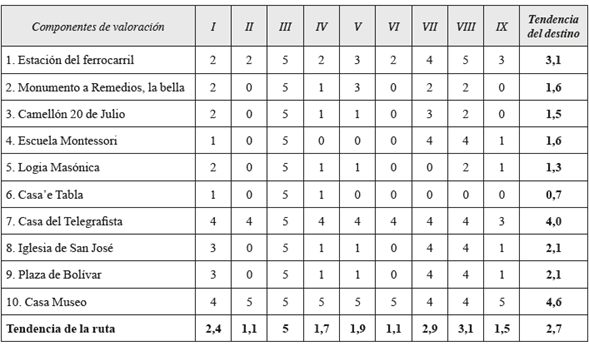 En los demás atractivos y destinos que conforman la ruta, los visitantes rápidamente reconocen los problemas y las fragmentaciones turísticas que existen en la ciudad, la carencia de un punto de información turística unificado y la inequidad que hay entre las inversiones y la atención prestada en los sitios de mayor atractivo cultural y promoción en comparación con los demás destinos. Tales limitaciones, dificultades e inequidades son resumidas en latabla 2, en la que se identifican los componentes turísticos básicos que deben caracterizar a un destino y producto turístico. Esta identificación se realizó a partir de la observación directa de cada lugar recomendado y del diálogo con los funcionarios encargados de los destinos cuando estuvieron disponibles o tuvieron una actitud receptiva para hablar sin apegarse al guion museográfico memorizado.