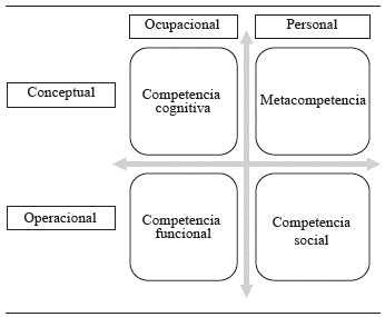 En este trabajo, el enfoque de competencias laborales es holístico y adopta los conceptos respecto a la clasificación de competencias de Echeverría (2002) expuestos en latabla 1, así como las dimensiones ocupacionales y personales de Le Deist y Winterton, presentadas en lafigura 1.