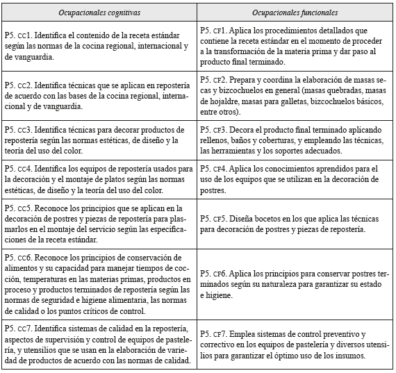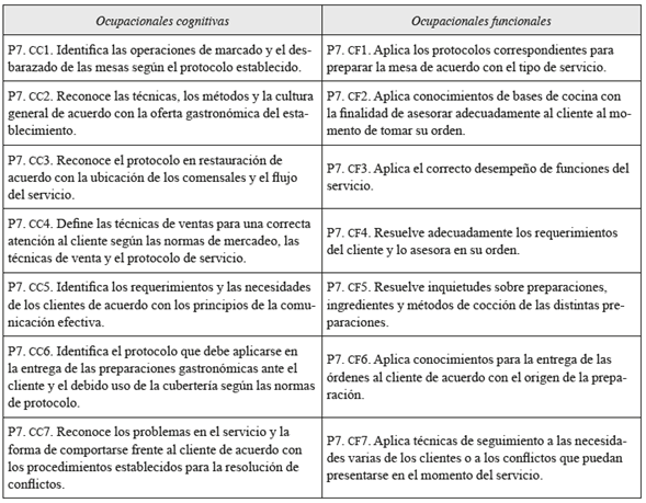Así mismo, para la conformación del instrumento se usaron los resultados de aprendizaje de la carrera de Gastronomía de la UTN, las normas del INEN Ecuador, el enfoque de certificaciones de profesionalización en hotelería y restauración de España y las dos dimensiones de competencia: ocupacional y personal (Le Deist y Winterton, 2005).