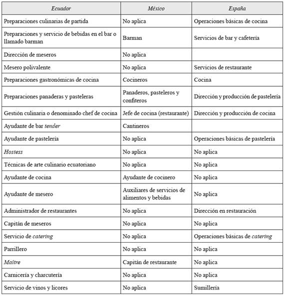 En cuanto a los puestos de trabajo que existen en las empresas entrevistadas, 18 restaurantes indicaron que cuentan con el puesto de chef de partida, la misma cantidad dijo tener el puesto de ayudante de cocina, 13 declararon el puesto de mesero, 9 establecimientos no identificaron ningún puesto de trabajo, 7 mencionaron la dirección de meseros e igual número citaron el puesto de chef pastelero, 4 cuentan con el puesto de panadero y 3 establecimientos reportaron el puesto de chef repostero. Estos mismos puestos de trabajo son los que se certifican en otros países, como España y México (vertabla 3).