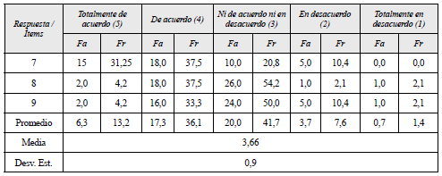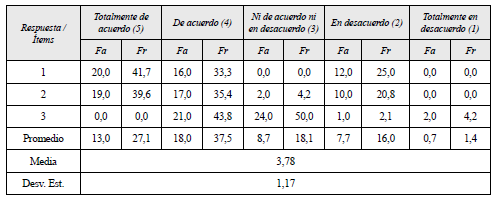 La tabla 2 presenta los resultados obtenidos con respecto a la adecuada aplicación del indicador "visión" en las organizaciones. Al respecto, el 56,3 °% de los encuestados optaron por las siguientes opciones de respuesta: "Ni de acuerdo ni en desacuerdo", "en desacuerdo" y "totalmente en desacuerdo". Esto indica que las empresas deben fortalecer este aspecto, tan fundamental en las organizaciones. Por su parte, el 43,7 °% restante escogió las otras opciones de respuesta, lo que implica la aplicación medianamente adecuada de la visión como fundamento de la empresa. La media se categorizó como moderadamente eficiente, con un valor de 3,57.
