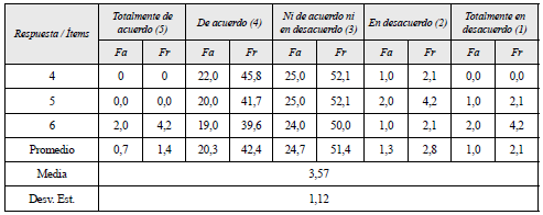 La tabla 3 presenta los resultados obtenidos con respecto al indicador "objetivos". En este caso, se indagó acerca de si en la empresa se cumplen los objetivos propuestos. El 57 % de los encuestados escogieron las opciones de respuesta "ni de acuerdo ni en desacuerdo", "en desacuerdo" y "totalmente de acuerdo", lo cual devela que los objetivos no se cumplen y que, por ende, este indicador no cumple con sus funciones en la organización. Por tal razón, las empresas que participaron en el estudio deben fortalecer este indicador, para que se supere ese 49,3 % de aceptación.