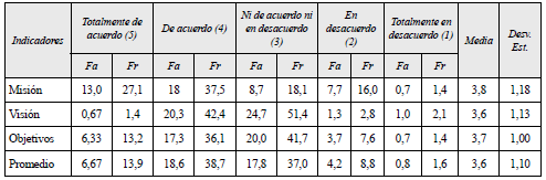 La tabla 1 muestra las respuestas de los encuestados con respecto a la adecuada aplicación del indicador "misión" en sus empresas. Como se evidencia, la mayoría de los participantes (64 %) optaron por las respuestas "totalmente de acuerdo" y "de acuerdo", lo que implica la aplicación medianamente eficiente de este indicador en las empresas. Por su parte, el 35,4 % considera que sus empresas no cumplen de manera adecuada con este indicador. Esto indica que las empresas que participaron en el estudio deben diseñar y emplear mecanismos que promuevan la misión de la empresa como fundamento para lograr el éxito.