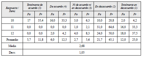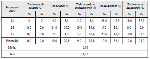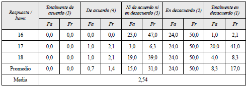 En relación con la tabla 7, se indagó la existencia de planificación operativa en las empresas. Al respecto, la población encuestada seleccionó las opciones de respuesta "ni de acuerdo ni en desacuerdo", "en desacuerdo" y "totalmente en desacuerdo", con un porcentaje de 79,2 %. Los resultados indican que el nivel de planificación operativa en las empresas es bajo, de modo que estas deben propender a mejorar este aspecto. Tan solo el 20,8 %> de los encuestados escogieron las demás opciones de respuesta.