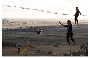 Básicamente, el highline es un deporte de equilibrio en el que se usa una cinta gruesa de nailon anclada entre dos puntos distantes. El objetivo consiste en mantener el equilibrio en la cinta para lograr caminar hacia adelante y atrás, y de este modo poder realizar figuras acrobáticas. Cabe señalar que la cinta es plana, por eso impide que gire sobre sí misma. Este deporte tiene dos modalidades, conocidas como el highline y el slackline, cuya diferencia reside en la altura a la que se sitúa la cinta: si esta se ubica entre dos puentes a una altura considerable se denomina highline, pero si la cinta se coloca entre dos árboles o columnas se llama slackline. La modalidad que se desarrolló en abril de 2017 en el cerro Arequita fue la del highline-yoga (figuras 5 y 6).