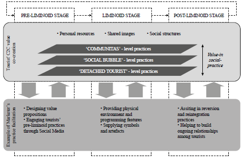 Durante estas etapas, el modelo establece tres niveles sociales en los cuales se produce la co-creación de valor entre consumidores, dependiendo del grado de interacción (Rihova, Buhalis, Moital y Gouthro, 2013). El nivel de menor integración entre consumidores es el del denominado "turista independiente", que establece mecanismos de separación o barreras con respecto a los otros turistas. Cuando se conforman grupos con un alto grado de afinidad, principalmente por parentesco o amistad, sus prácticas se desarrollan en el nivel de las "burbujas sociales". Finalmente, existen diversos factores que en contextos determinados producen un mayor sentido de pertenencia, unión e integración con extraños o desconocidos; en el modelo de los autores, este nivel es llamado de communitas.