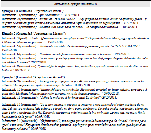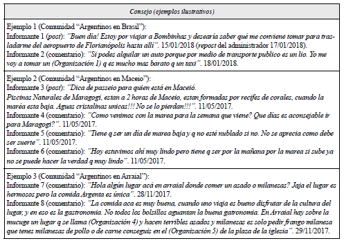 Los datos obtenidos se basan en inferencias, a partir de evidencias e indicios manifestados en comentarios (Moya y Majó, 2017) por parte de usuarios participantes, del contenido generado en las comunidades online. Cabe destacar que el administrador de la comunidad cumple un rol de líder en las publicaciones y/o interacciones en las comunidades observadas, establece normas y directrices. Por otro lado, los posts utilizados para la muestra fueron elegidos a partir de un criterio temático y relacional, es decir, se consideraron ejemplos ilustrativos transcritos en forma directa y sin ningún tipo de modificación (tablas 1 a 4) que tuviesen relación con el turismo y cuyas interacciones respondieran a relaciones en el marco de prácticas que involucran tanto a turistas como a residentes (miembros de la comunidad local). Se descartaron interacciones de declarado interés comercial entre empresas y consumidores (B2C). Aquellas publicaciones que no recibieron interacciones tampoco fueron consideradas por no establecer relaciones recíprocas de co-creación. De acuerdo con Kozinets (2016), los "datos deben ser recopilados de forma selectiva para elegir partes representativamente interesantes y luego recogerlas de una manera intrigante para argumentar a favor de un principio central" (p. 2).