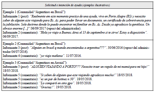 La ayuda puede ser considerada una forma de compartir recursos y asistencia entre personas desconocidas que genera un sentido de vecindad entre ambas partes (Rihova et al., 2018). En el ámbito de las comunidades online analizadas, a diferencia de lo que ocurre en el contexto offline, esta práctica fue identificada como una acción en potencia o una "promesa de acción", es decir, se observan pedidos de ayuda por parte de informantes que solicitan asistencia, y propuestas de auxilio por parte de aquellos usuarios participantes en la comunidad que manifiestan la intención de concretar la asistencia. La ayuda, además de presentar una relación instrumental -y, del mismo modo que el consejo, valor funcional a una necesidad por parte del solicitante-, tiene la particularidad de producir como resultado valor afectivo a un nivel público. Se trata de una práctica con menor nivel de superficialidad y con un mayor vínculo emocional que el consejo durante la interacción entre los usuarios participantes. También se la considera entre las prácticas sociales que suscitan valor de red por su nivel de inmersión en la noción de comunidad (online). En la tabla 2 se puede observar uno de los ejemplos de solicitud e intención de ayuda entre un residente y un turista, representados por la interacción entre los informantes 1 y 2, respectivamente.