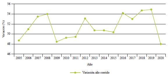 La figura 3 muestra la variación en la tasa de ocupación hotelera en Colombia al mes de abril de 2020. La tasa, que desde 2010 venía aumentando de forma moderadamente sostenida, cayó en abril de este año por debajo del nivel alcanzado en 2005, a una variación del 40%.